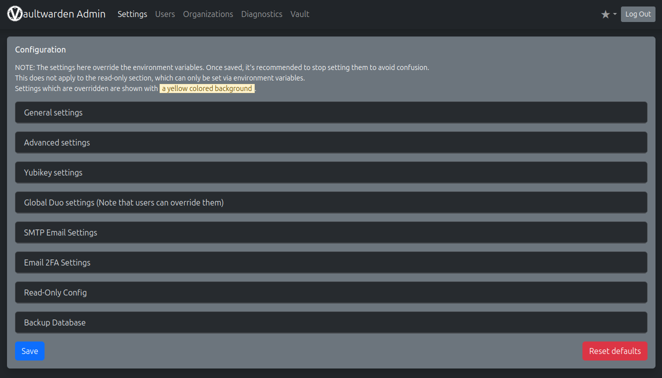 Per impostazione predefinita, questa interfaccia amministrativa non è abilitata. È necessario impostare un token di autenticazione e aggiungerlo alla distribuzione di Vaultwarden per abilitarla. Ecco come generare un token.