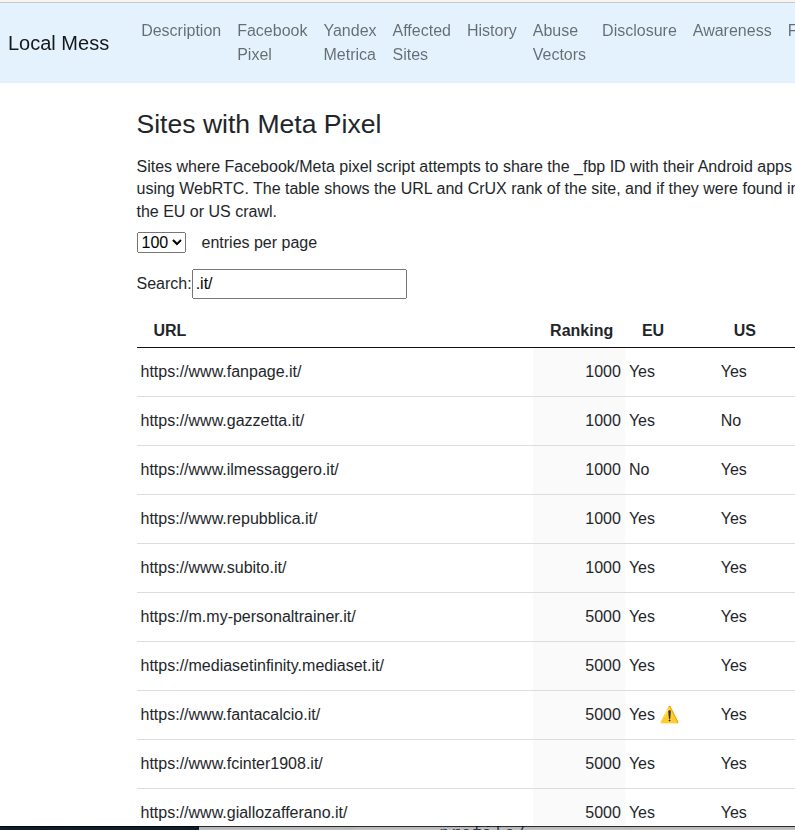 L’impatto è stato proporzionale alla popolarità: un sito top 1000 come Repubblica, visitato quotidianamente da milioni di italiani, ha esposto un numero di utenti enormemente superiore rispetto a portali di nicchia. Per nove mesi, chiunque visitasse questi siti con un dispositivo Android e le app Meta installate è stato potenzialmente tracciato attraverso questo canale nascosto.