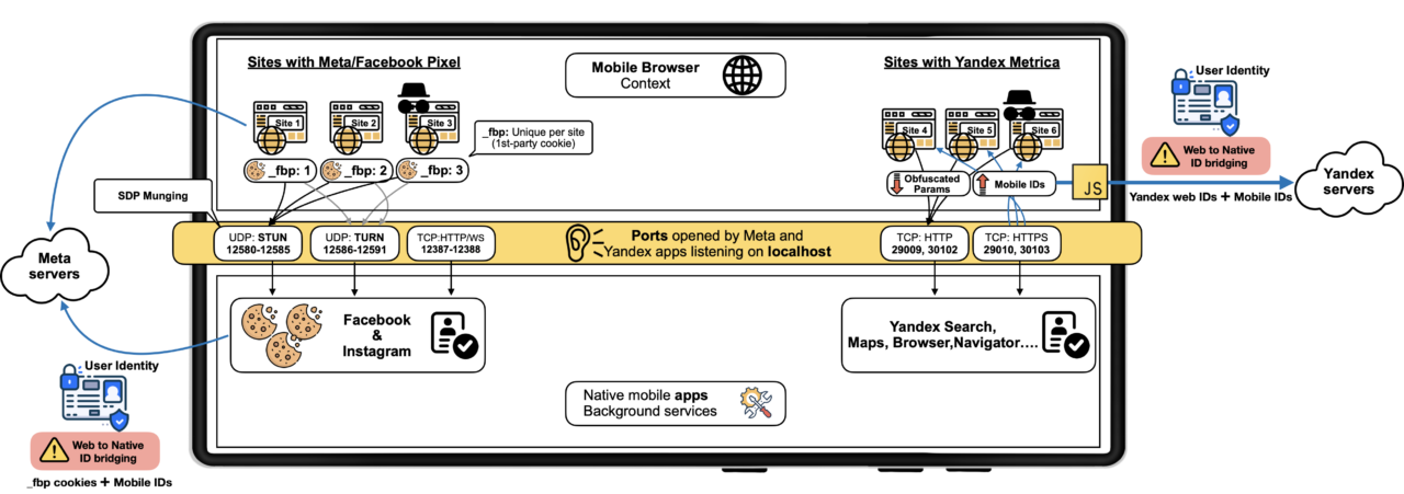 Il meccanismo era sofisticato. Il Meta Pixel, caricato in un browser Android, utilizzava WebRTC per trasmettere il cookie _fbp verso porte UDP specifiche (12580-12585) tramite una tecnica chiamata SDP Munging. Le app Facebook e Instagram, in esecuzione in background, erano configurate per ascoltare su queste porte, catturando i dati del cookie e collegandoli al profilo dell’utente autenticato nell’app.
