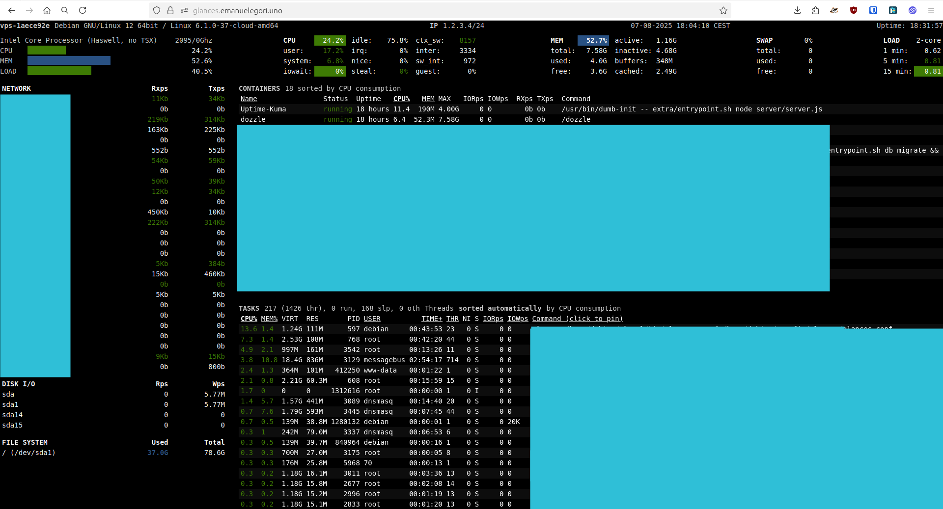 e cerchi qualcosa di più completo, ma senza fronzoli, Glances è la manna. È un monitor in tempo reale open source leggero ma potentissimo scritto in Python che tiene d’occhio CPU, RAM, FileSystem, rete, I/O, sensori, container e altro in tempo reale, tutto in un unico dashboard pulito e dinamico.